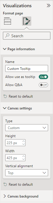 This page will serve as the custom tooltip for your main visualization (Orders by Product Category). In other words, once configured, the content you craft on this new page will appear when someone hovers over a data point in the main visual.