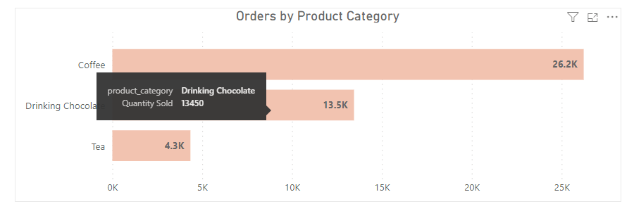 Currently, if we hover over any of the three categories in this viz, Power BI will automatically offer us information about the specific category’s order quantity as a tooltip.