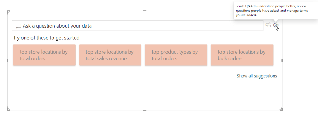 - Suggest questions to be displayed for your dashboard consumers to nudge them towards valuable insights. Suggesting queries not only aids in training the AI but also assists users in formulating effective questions, improving the data exploration experience via the Q&A feature.