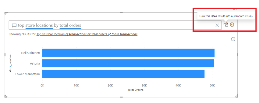 A standout feature of Power BI’s Q&A is its ability to transform query results directly into standard visuals for your dashboard. Picture this scenario: while interacting with the Q&A, you stumble upon a particularly insightful answer to one of your questions. This insight is not only valuable for your immediate needs but also merits broader visibility on your main dashboard.