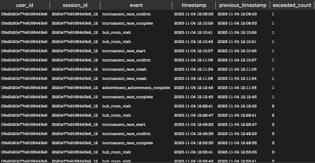 Tracking Session Breaks: Whenever session_exceeded is 1, it increments the cumulative sum (exceeded_count). This effectively “marks” a new sub-session starting from that point. Subsequent rows within the same original session will have an incremented exceeded_count, signifying they belong to a new logical sub-session.